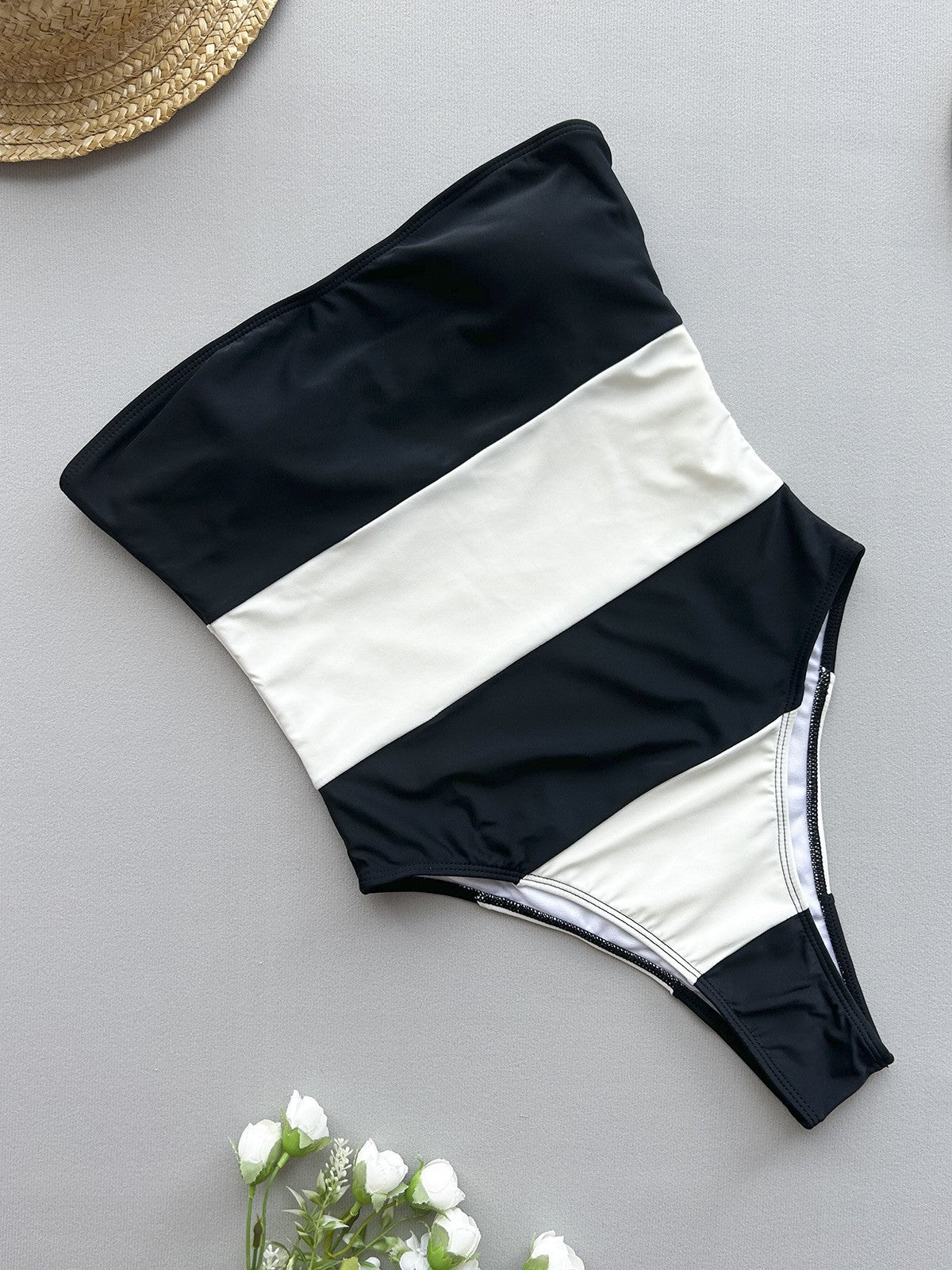 Take the plunge in the Shore Stripe - a strapless one-piece that redefines clean lines and bold confidence. Designed in a statement black-and-white block pattern, this suit hugs you in all the right places while offering a sleek, sculpted silhouette.