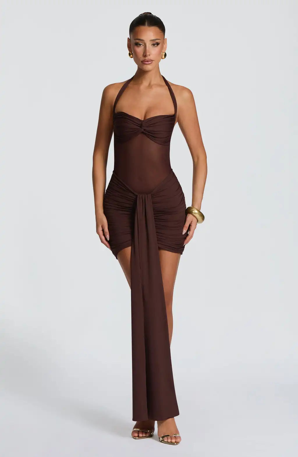Halter Neck Open-Back Mesh Paneled Ruched Slim-Fit Mini Dress