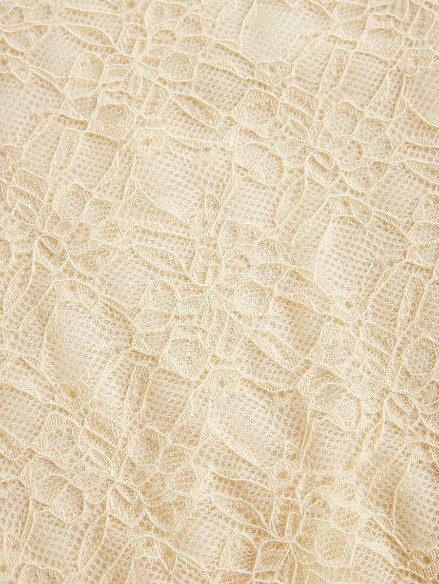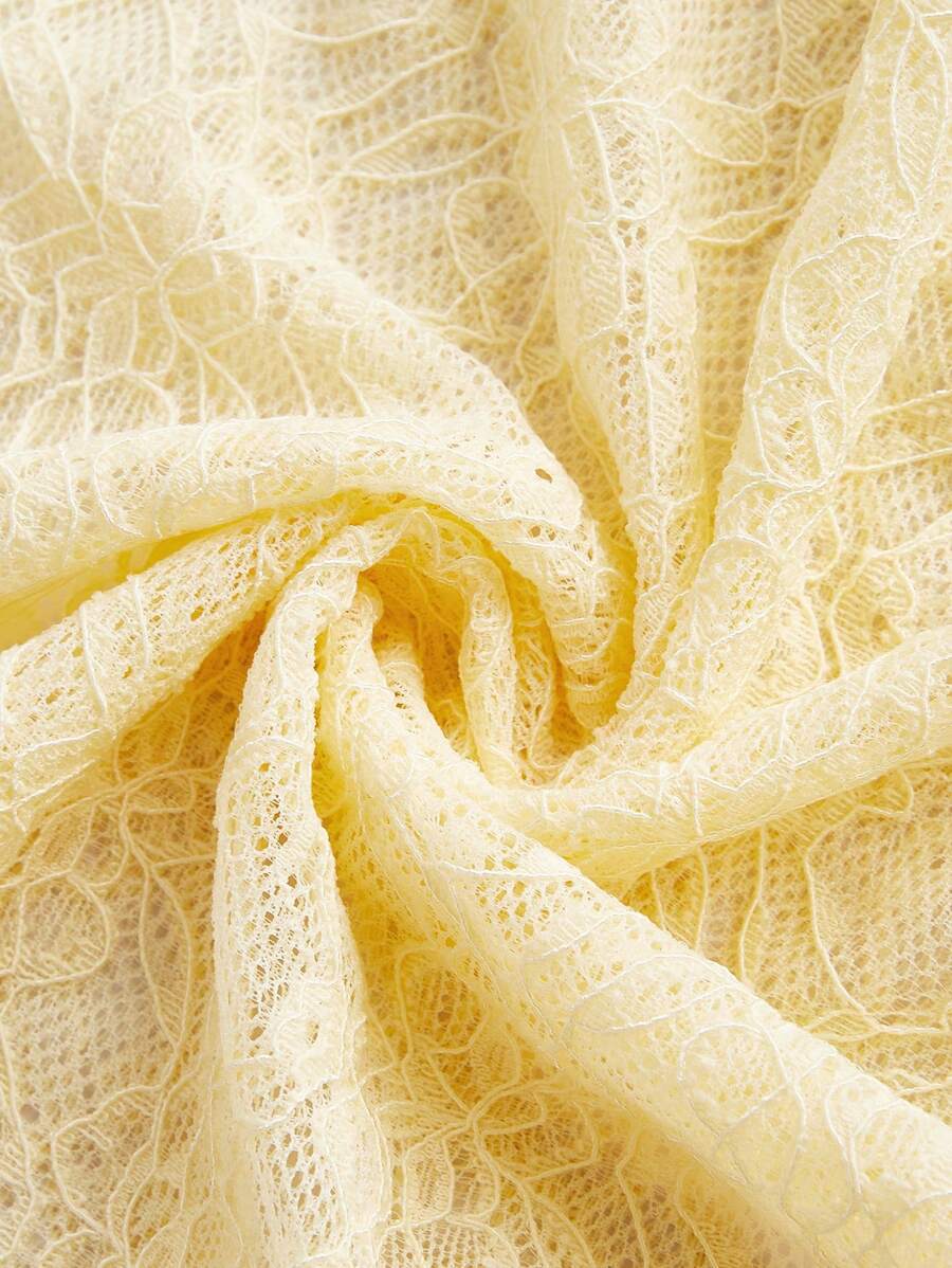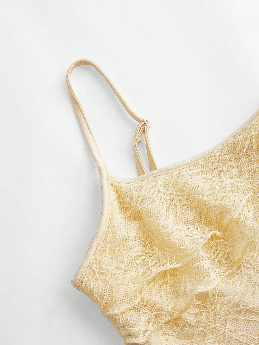 This set includes a ruffled cami top with adjustable straps and a high-waisted maxi skirt, both made from soft stretch lace in a buttery pastel hue. The asymmetrical hem on the skirt adds graceful movement, while the top’s subtle frills keep it playful and feminine.