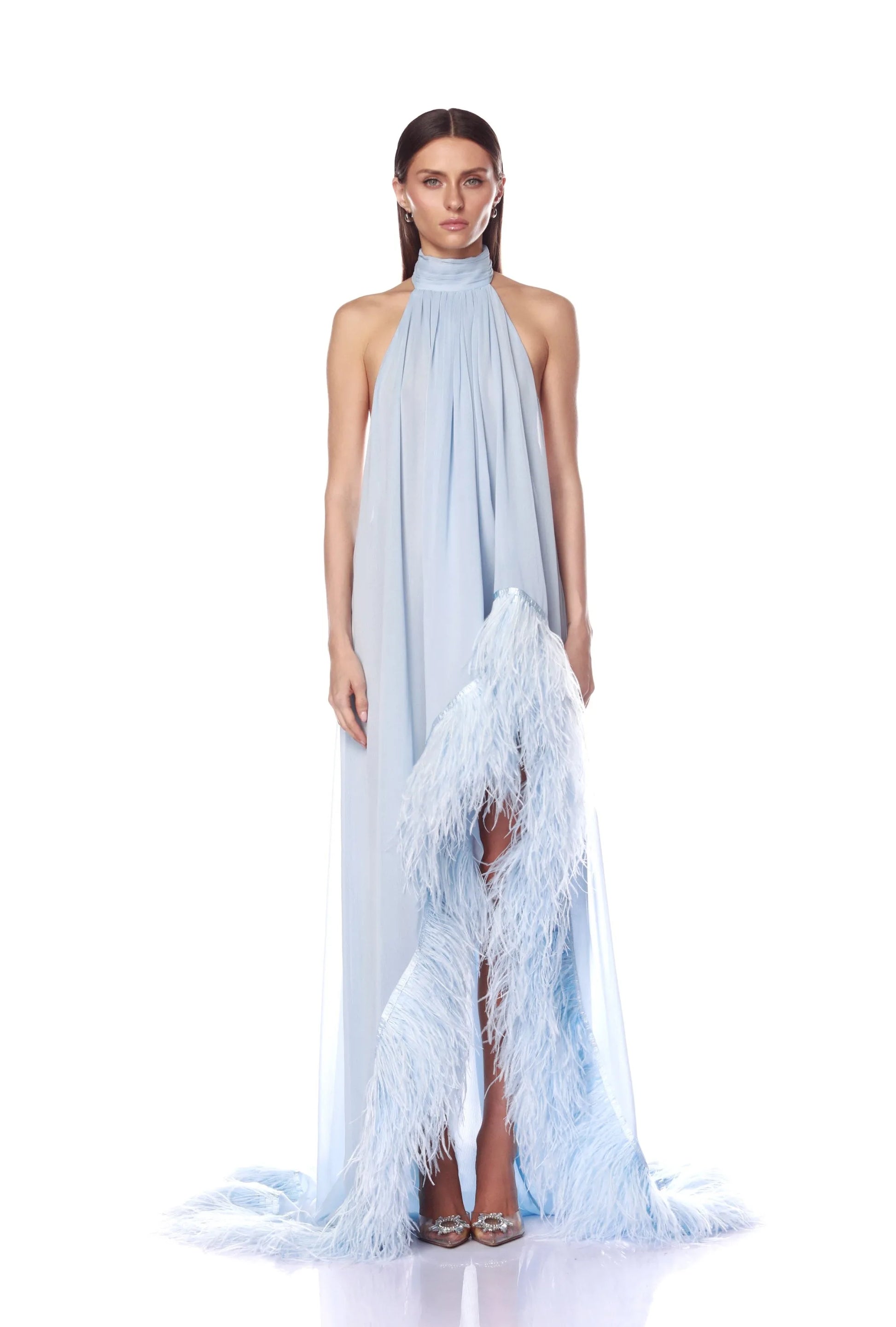 Light Blue Halter Feather Trim Backless High-Slit Evening Gown