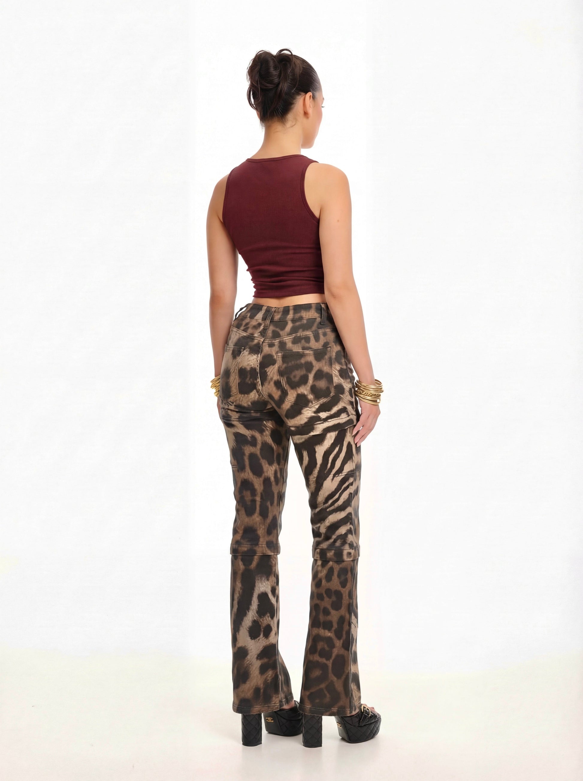 Crafted from a multi-tonal animal-print denim, they balance high-fashion impact with maximum utility, making them the ultimate choice for effortless travel and seamless day-to-night transitions.