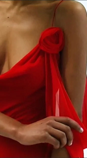 Scarlet Red 3D Rose Decor Spaghetti Strap Backless Draped Evening Maxi Dress