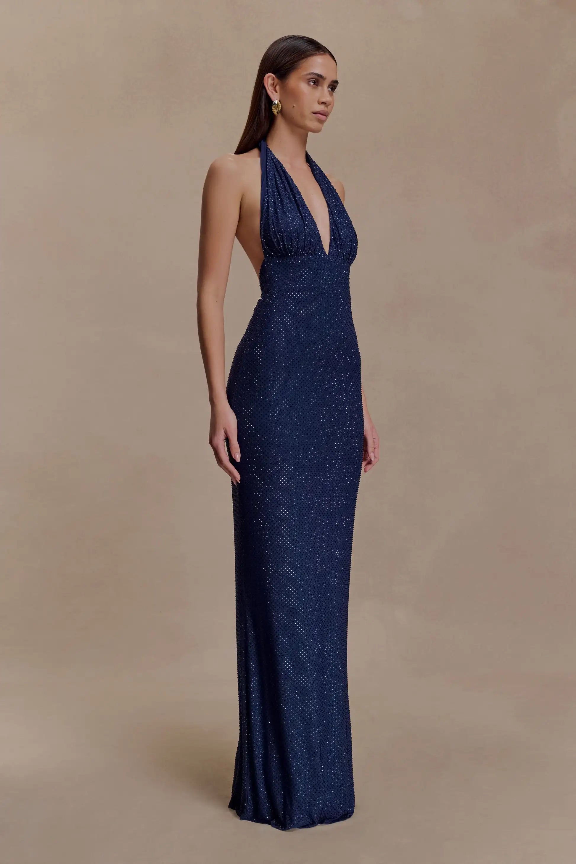 Sexy Halter Deep V-neck Slim-Fit Solid Color Rhinestone Dress