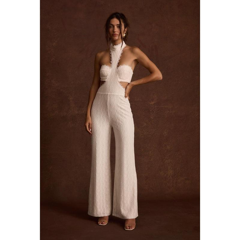 Elevate your evening wardrobe with this sophisticated lace jumpsuit, expertly designed to make a statement. The halter neckline and off-the-shoulder cut create a flattering silhouette that balances elegance with allure. Delicate lace detailing adds texture and visual interest throughout, while the streamlined one-piece design offers effortless style for cocktail events, date nights, or upscale gatherings. The combination of strategic cutouts and refined construction ensures you'll command attention with confidence and poise.
