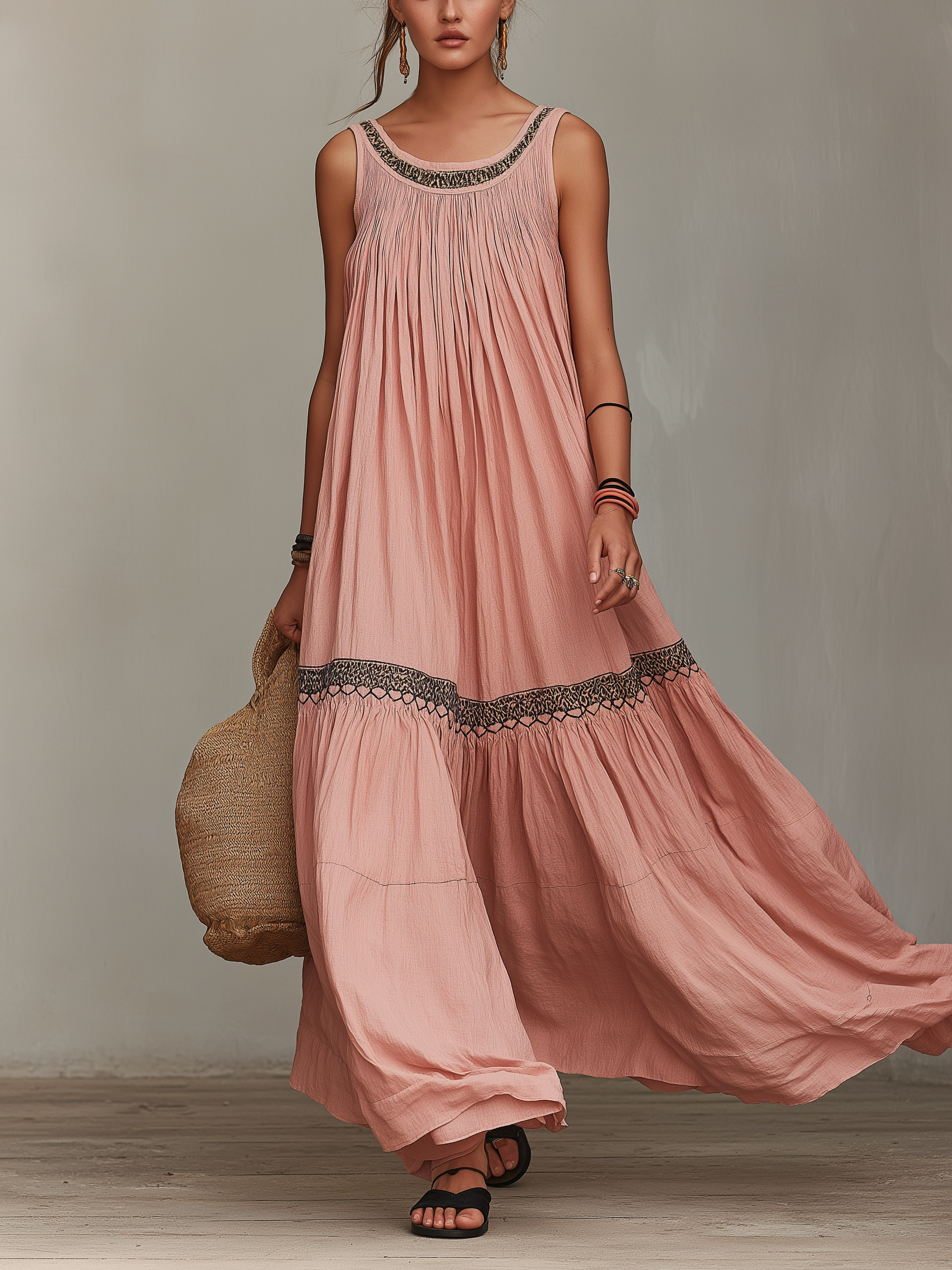 Women's Casual Grey-Pink Cotton-Linen Maxi Dress — Embroidered, Round Neck, Sleeveless, Loose Fit